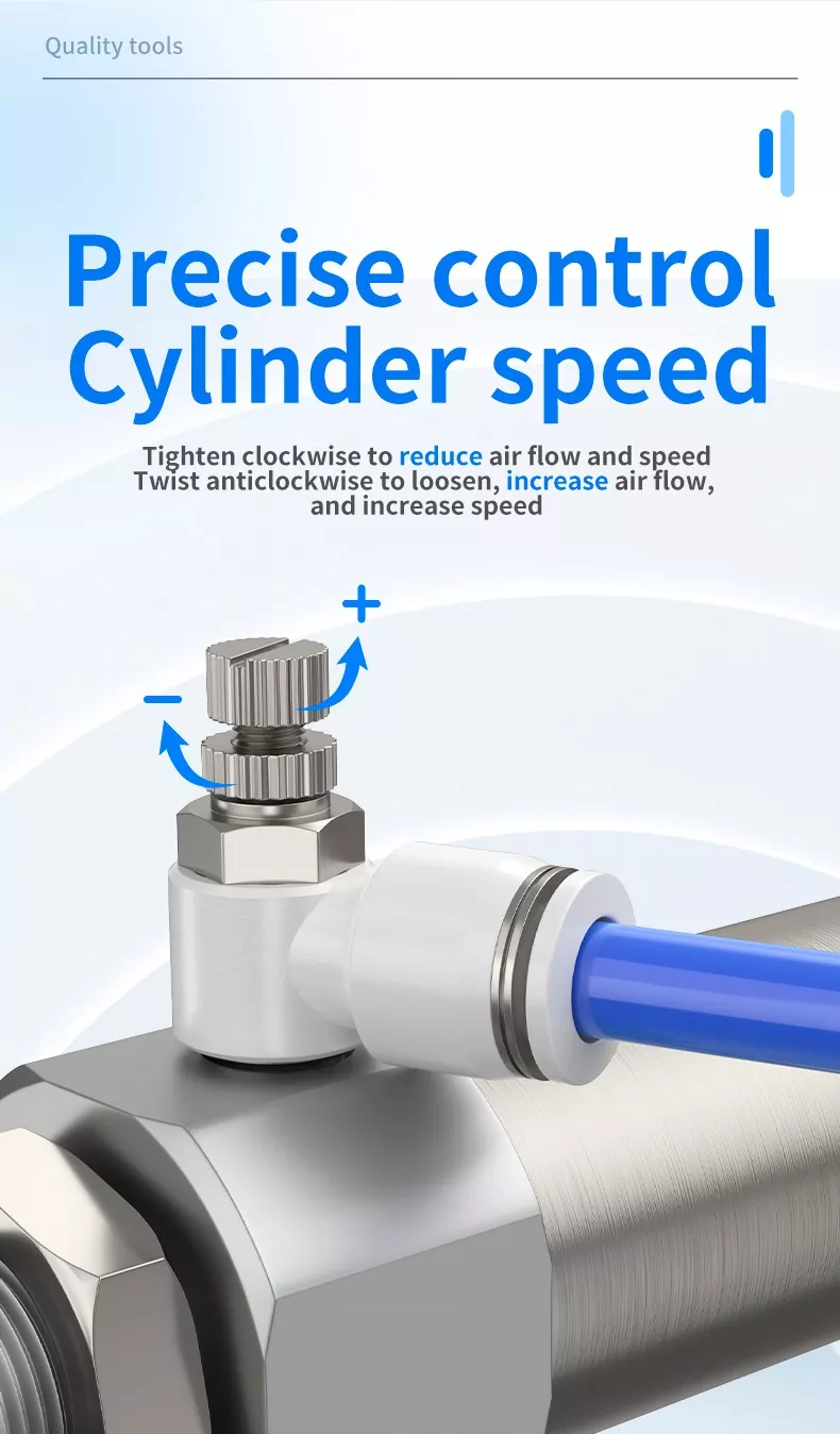 속도 컨트롤러는 액추에이터의 확장 및 수축 속도를 조정하는 데 사용되는 일반적인 공압 구성 요소입니다. 스로틀 밸브는 본질적으로 실린더 속도를 제어하는 유량 조정 구성요소이지만 설치 위치, 스로틀 방향 및 본체 설계가 다릅니다. 제어 방식에 따라 배기 조절형과 흡입 조절형으로 나눌 수 있습니다.