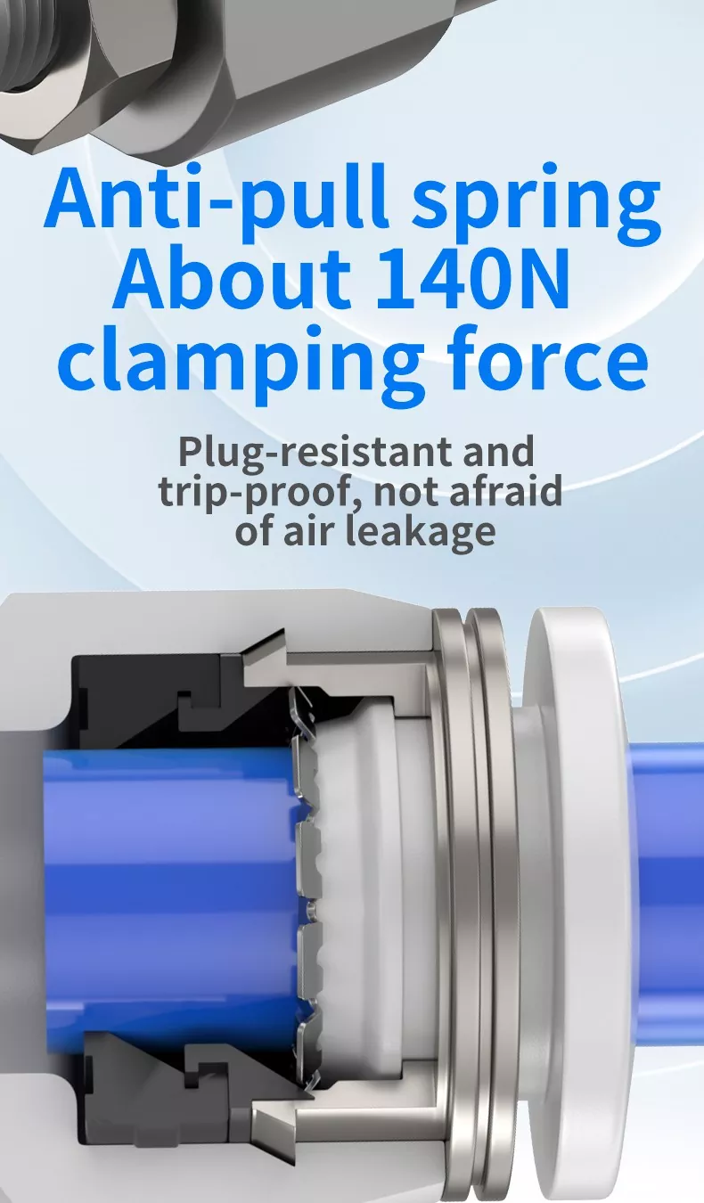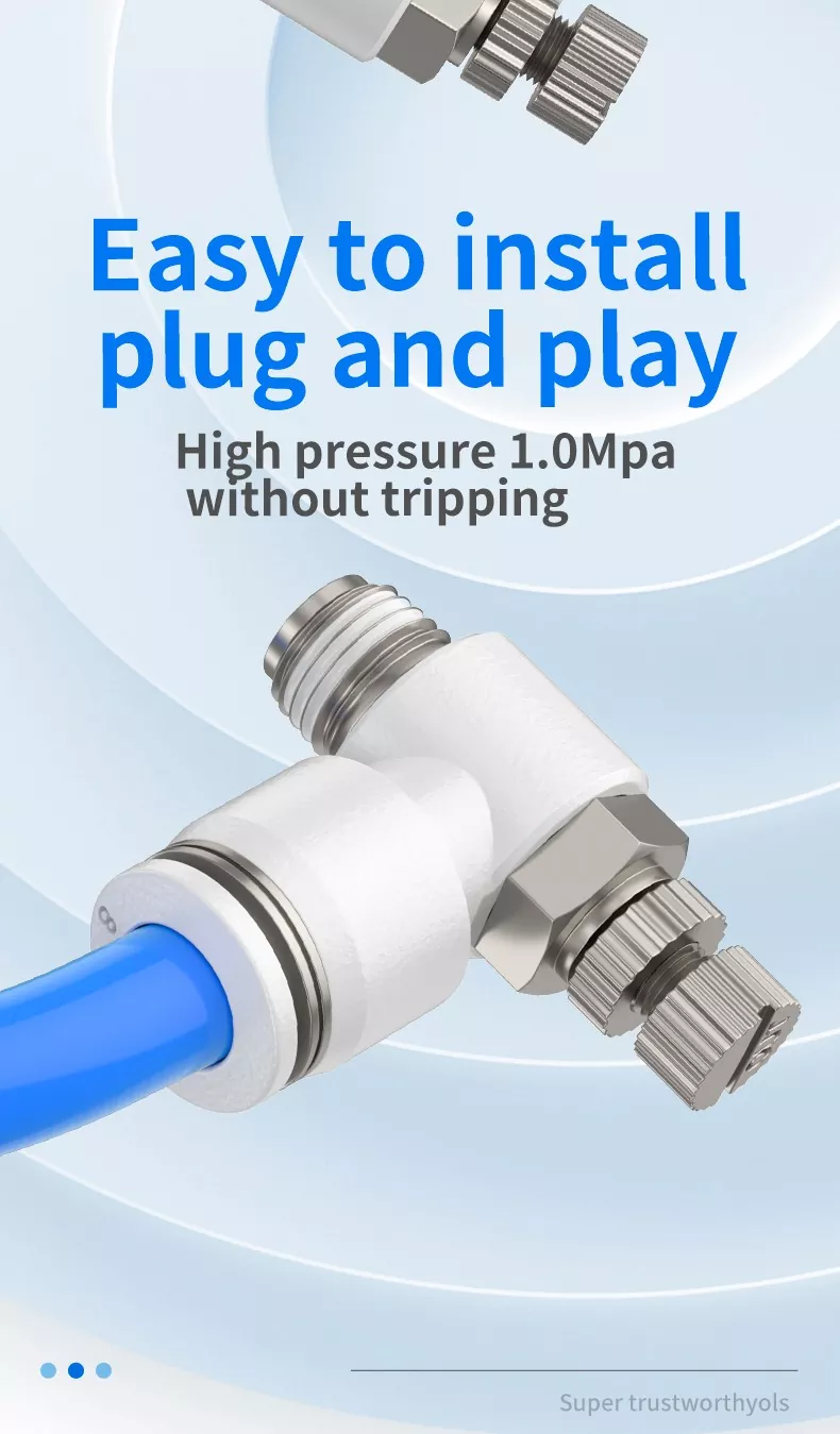 이는 입구 및 배기 스로틀 밸브이며 캡 표시 'B'와 'OUT'으로 구별됩니다. 함께 사용할 수 있습니다. 흡입 스로틀 밸브는 공기 공급 흐름을 조정하고, 배기 스로틀 밸브는 보다 정밀한 시스템 제어를 위해 실린더 속도를 제어합니다.