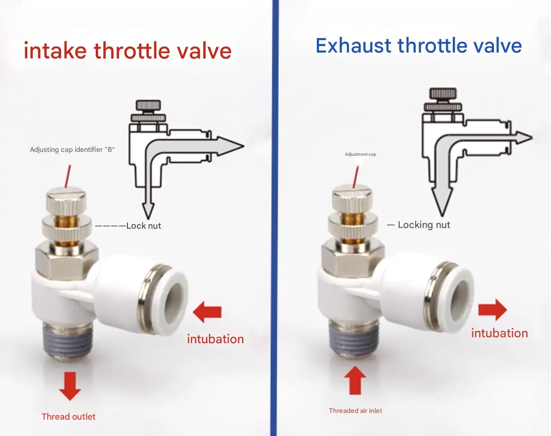 흡입 스로틀 밸브는 튜브를 통해 공기를 흡입하고 나사산 포트를 통해 배기합니다. 배기 스로틀 밸브는 나사산 포트를 통해 공기를 흡입하고 튜브를 통해 배기합니다.