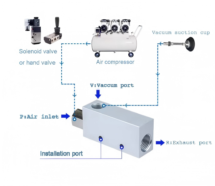 진공 펌프 및 진공 발생기. 진공펌프는 흡입구에 부압을 발생시키고 배기구는 직접 대기를 통과하게 하는 기계장치로 양단의 압력비가 높아 가스를 추출한다. 진공 발생기는 압축 공기의 흐름을 활용하여 일정 수준의 진공을 형성하는 공압 부품입니다. 진공펌프에 비해 구조가 간단하고 부피가 작으며 무게가 가볍고 가격이 저렴하며 설치가 편리하고 지지부재와의 배합이 용이하며 진공발생과 해제가 빠르며 저유량의 단속작업에 적합하고 분산사용에 적합하다.