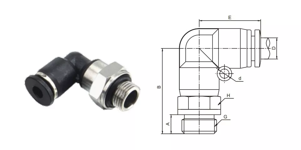 팔꿈치 피팅 : 튜브가 일반적으로 90도 각도로 방향을 바꿀 수있는 공압 피팅.