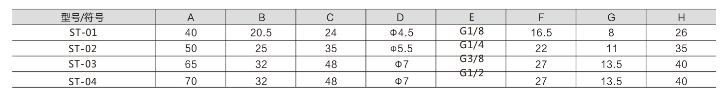 에어 튜브 피팅을 올바르게 선택하지 않아 포트의 공기 흡입 또는 배출이 매우 작아지면 밸브 코어가 완전히 이동하지 않아 모든 포트가 연결될 수 있습니다. 이를 방지해야 합니다. ST-01:G1/8 ; ST-02:G1/4 ; ST-03:G3/8 ; ST-04:G1/2