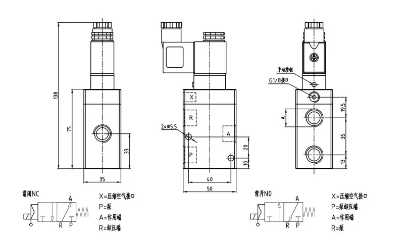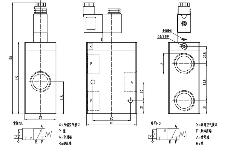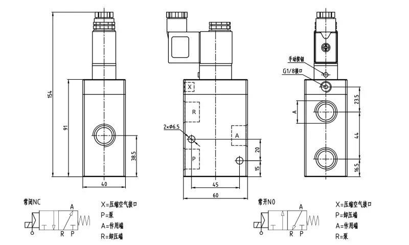 나사형 포트(P,A,R) 크기는 G3/8, G1/2 및 G1로 제공되며 압축 공기 포트(X)는 G1/8로 제공됩니다.
