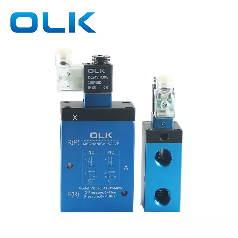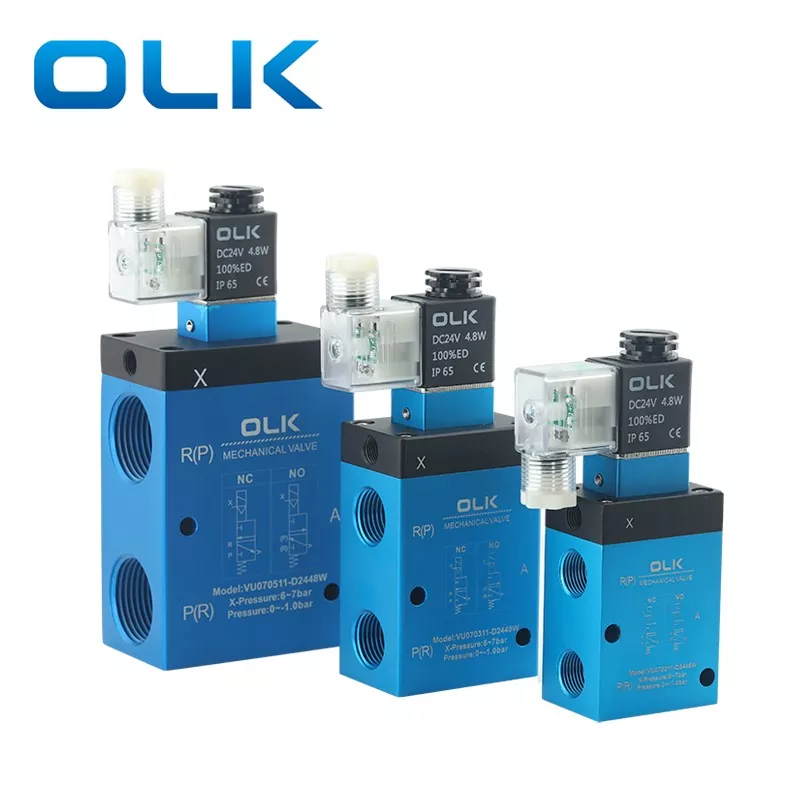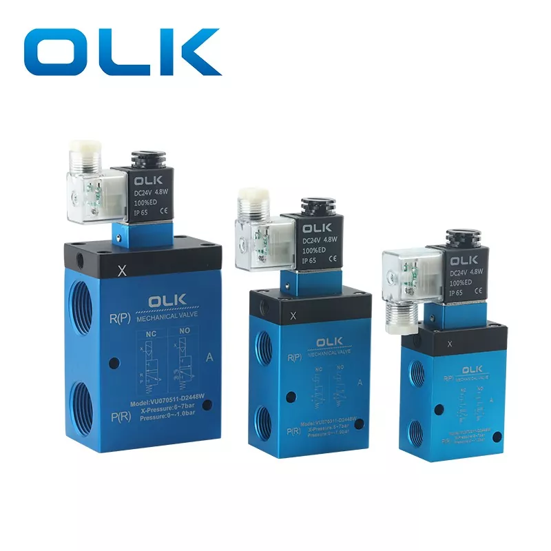 VU07 진공 솔레노이드 밸브는 3방향으로 내부 또는 외부 파일럿 제어가 가능합니다. 밸브 본체는 파란색 알루미늄 합금으로 제작되었으며 대유량을 위해 큰 구멍으로 설계되었습니다.